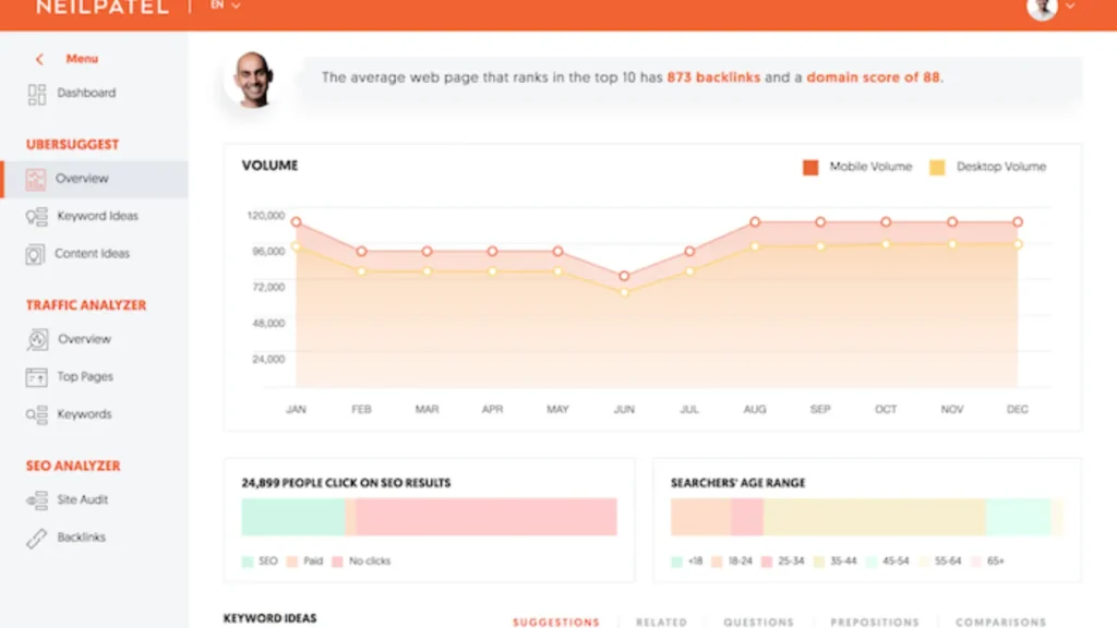 This one’s like your personal SEO coach. It was made by Neil Patel and is one of the easiest tools to use. You can put in a keyword and instantly see how many people search it, how hard it is to rank, and what websites are already ranking for it.